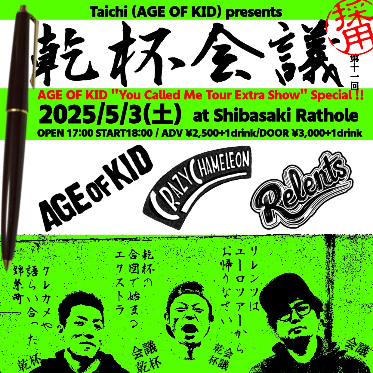【乾杯会議 第十一回】 AGE OF KID “You Called Me Tour Extra Show!!”編 2025/05/03(Sat) 2025年05月03日(土) 柴崎RATHOLE W/ OPEN:17:00 START:18:00 ADV 2500円 DOOR 3000円