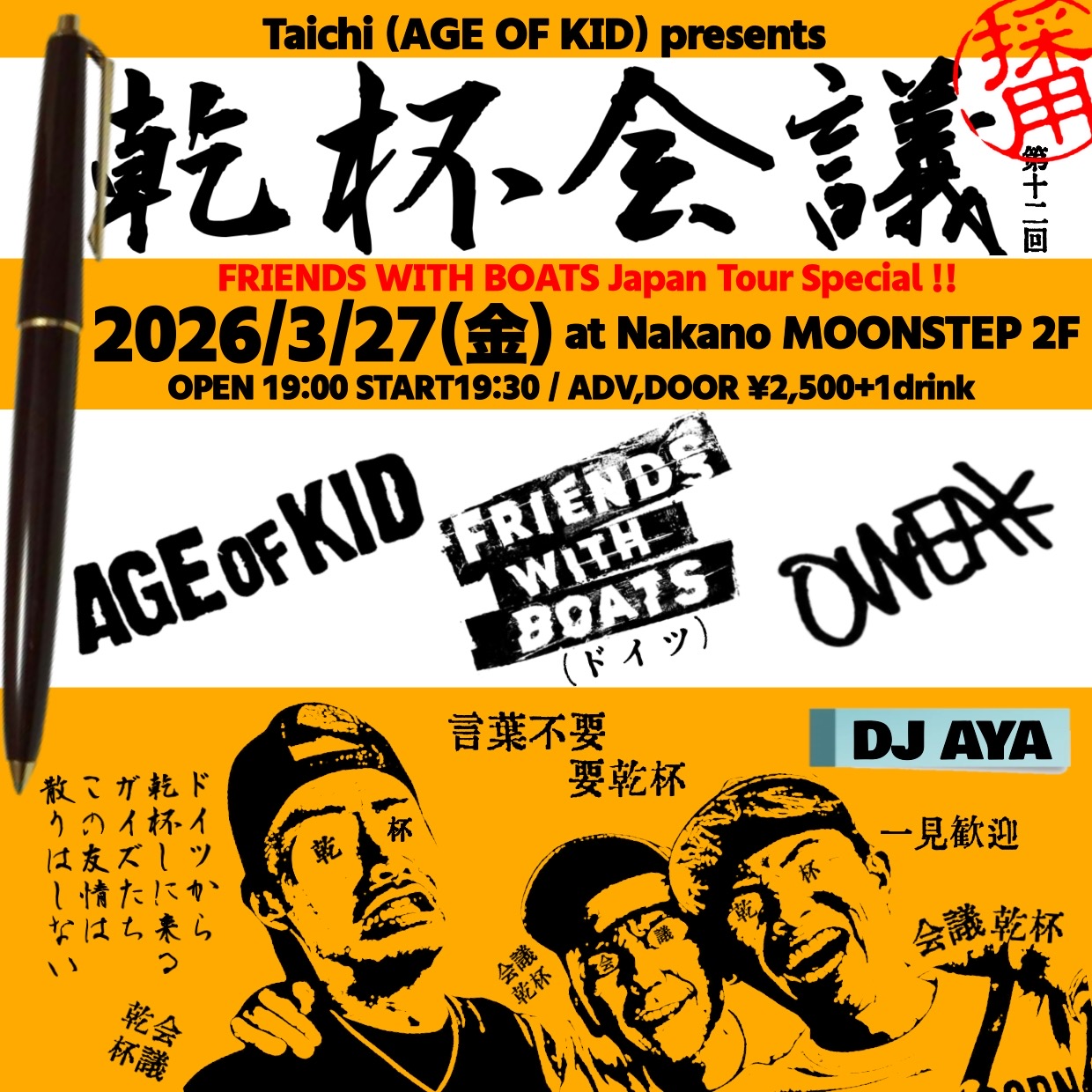 乾杯会議 第十二回 FRIENDS WITH BOATS Japan Tour スペシャル 2026/03/27(Fri) 2026年03月27日(金) 中野MOONSTEP 2F W/FRIENDS WITH BOATS,OWEAK,DJ AYA OPEN:19:00 START:19:30 ADV 2500円 DOOR 2500円 チケット予約 会場 日付 お名前 メールアドレス 電話番号 枚数 1234